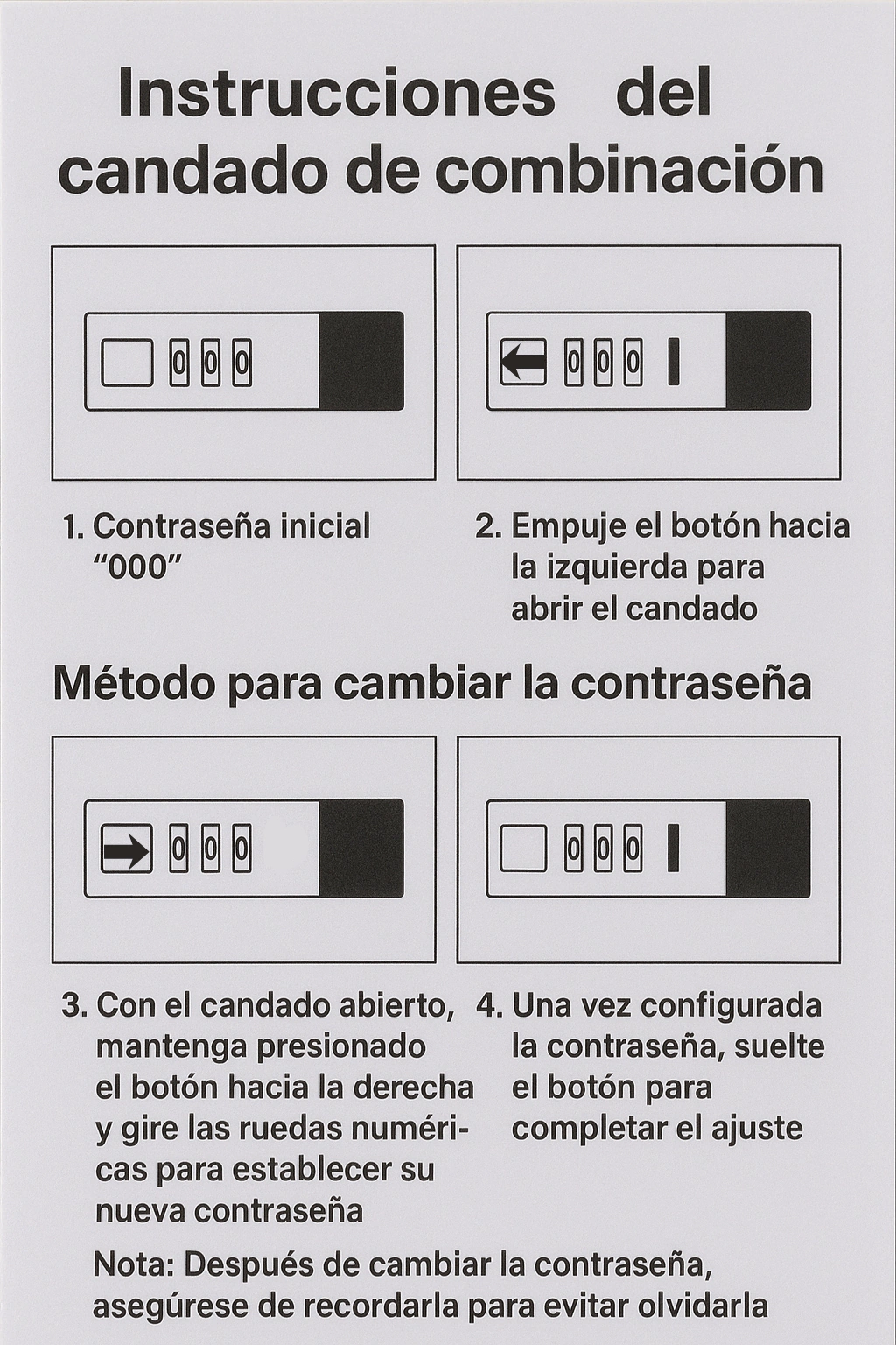 Tiene un candado con combinacion. ( En las fotos vas a encontrar el instructivo para configurar la combinación numérica)