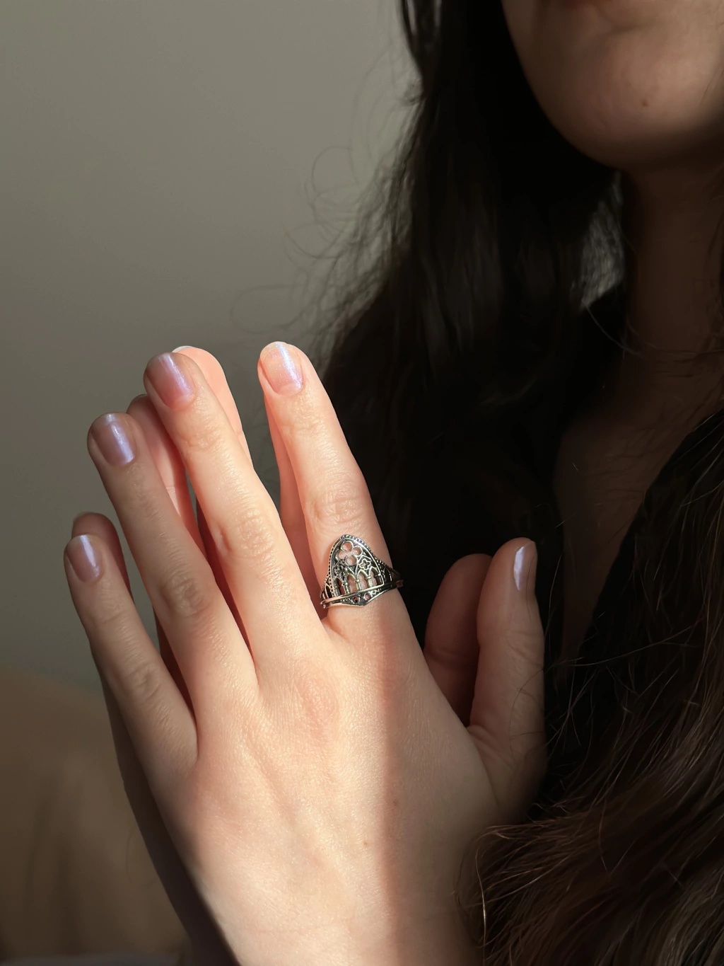 Anillo con diseño de catedral gótica. Hecho en aleación resistente, con acabado envejecido. Además, es regulable, por lo que se adapta fácil a distintos tamaños.