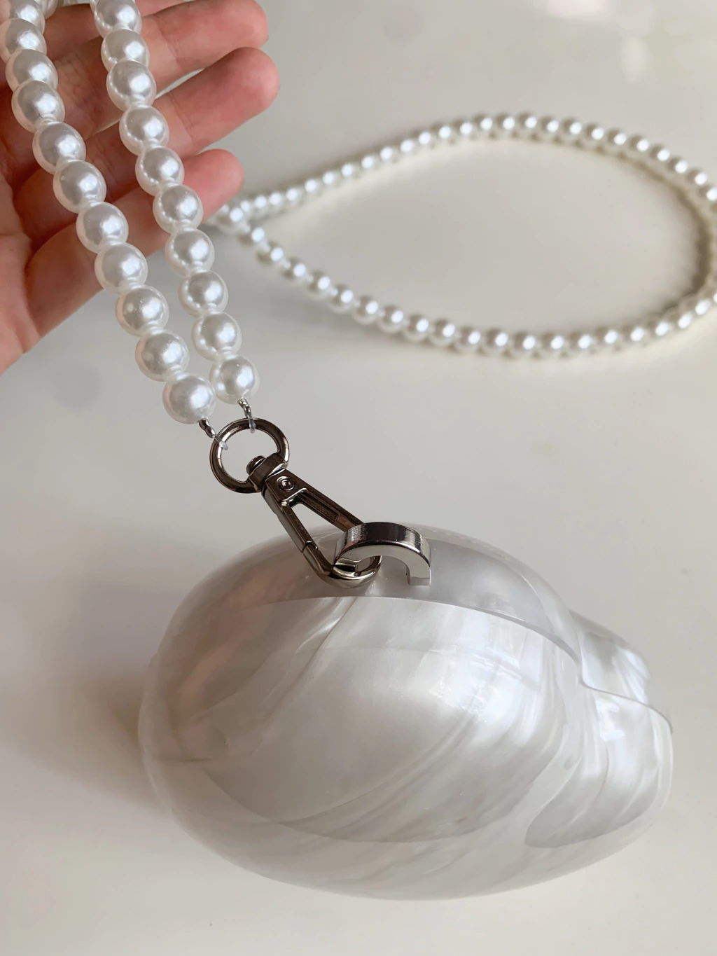 Cartera en forma de corazón con acabado nacarado. Tiene un cierre imantado súper firme y una correa de perlas acrílicas. Tambien trae una correa corta de cuerina si la queres llevar en la mano.